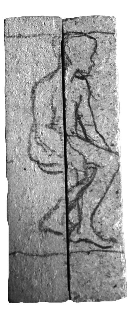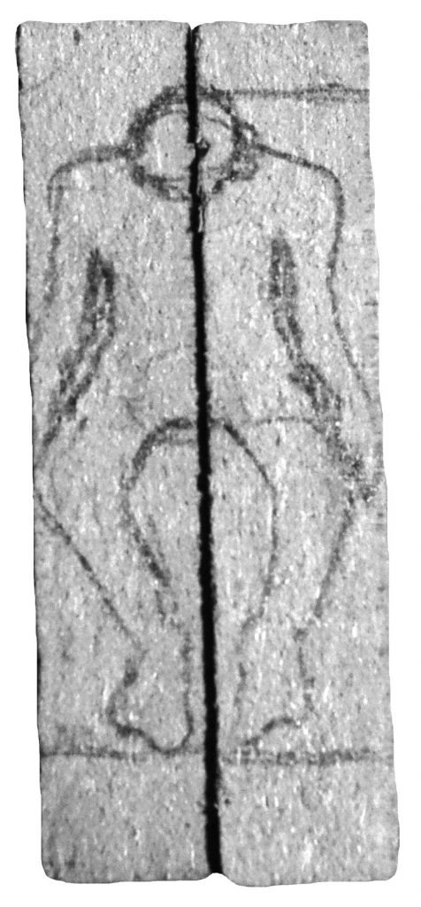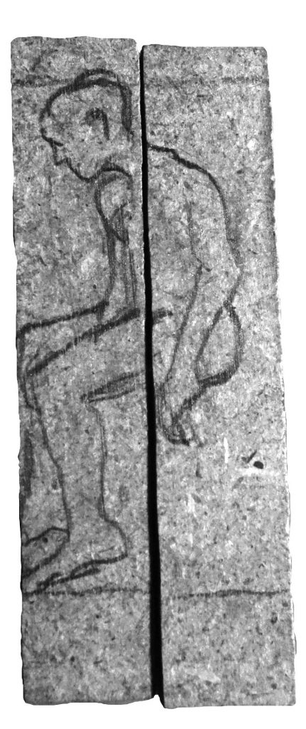 The twisted position of the body is not specific to this drawing alone. It comes back again and again, in a body bent to the point of fracture, in an elegant body, dancing. Several drawings are of large contorted figures, tragic and/or almost mannerist: a silhouetted body that curtsies, leg bent, open hand throwing dice while the head looks on. Or, yet again, a body seen from the back that appears to be pulling away – is it dancing or is it wrenched in pain? The legs seem on the verge of breaking; of feet and hands there remain nothing but a ragged stump and running ink. Still, he – or rather, she – dances, head thrown far back, buttocks front and centre, right hand holding a lifted skirt. This body is at once whole and dismembered, joyous and suffering, emotionally charged, and in full combat.