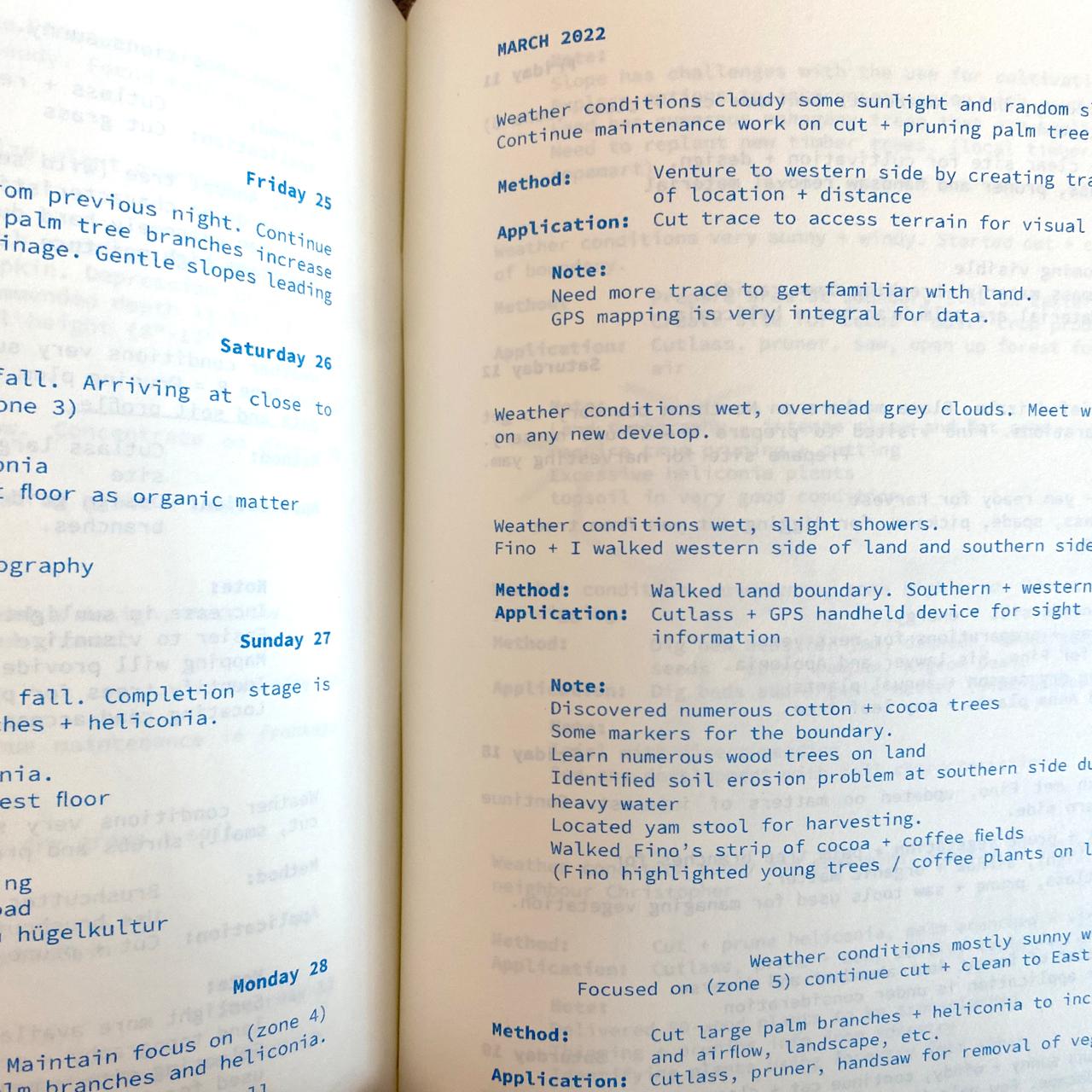 “How could my art, born from an intimate engagement with ecology, exist within a system that so often exploits the very land it depends on? This tension is unresolved, a friction I carry with me… Forest Notebooks is not an escape from these questions but a confrontation with them. It is an attempt to transcend the traditional boundaries of art and knowledge production, to forge a practice that contributes to human development, empowerment, and ecological consciousness. The forest taught me that growth is not linear, that belonging is not ownership, and that true creativity emerges not in isolation but in reciprocity.” — Mario Lewis, “The forest as teacher” from Forest Notebooks.