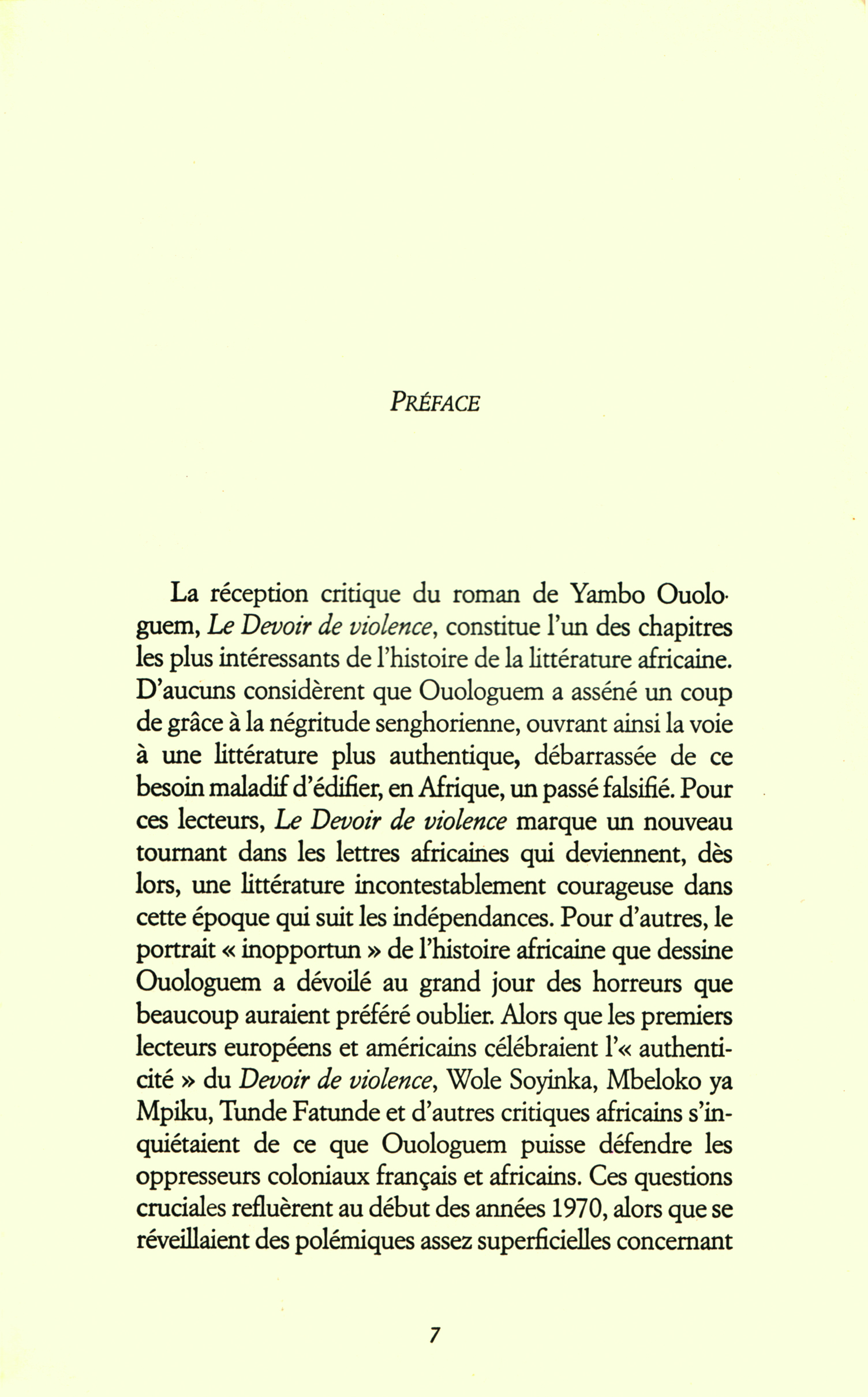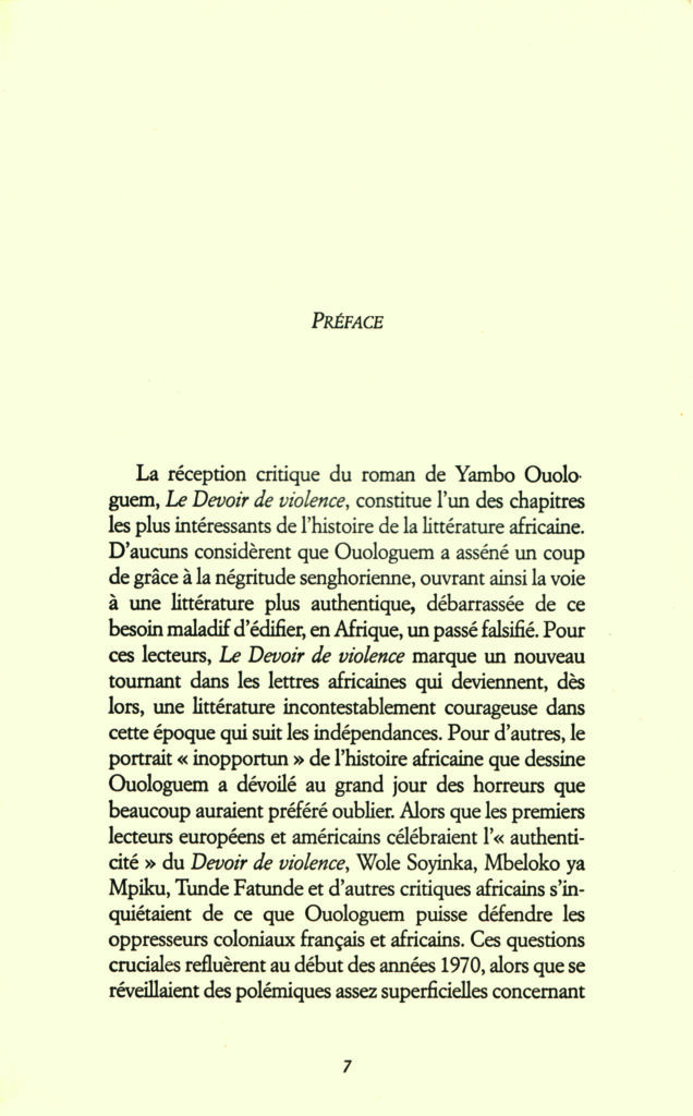 Serpent à Plumes’ republication of Yambo Ouologuem’s Le Devoir de violence has given this novel a new lease of life. Christopher Wise’s preface insists on the novel’s place in the history of African literature, highlighting the author’s biographical details and situating the book in the historical context of pre-colonial Mali. It also confronts the first publisher’s (Editions du Seuil) ambiguous attitude towards the author and points out other writers’ (Wole Soyinka for example) short-sightedness concerning this book. However, Wise’s preface overlooks the considerable interest that French critics showed in Le Devoir. While it is true that much of the mainstream press and Editions du Seuil dismissed Yambo Ouologuem, some French critics never stopped demanding his rehabilitation.