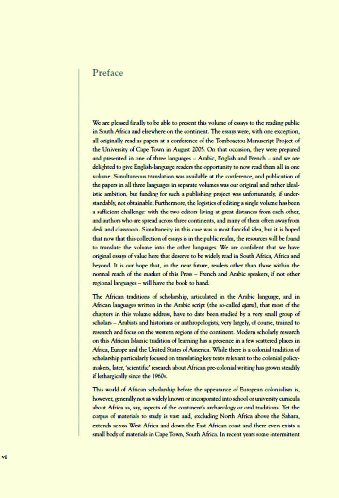This book should be understood as a product of the history of the quest to determine the value of Timbuktu, its mosques and sites of learning as well as of the meanings of its ancient manuscripts and the challenges of conservation. It should also be understood as part of post-apartheid South Africa’s encounter with Timbuktu, its manuscripts and its narratives of writing and historicity, and how these have been marshalled in the service of the creation of South Africa’s post-apartheid modernity.